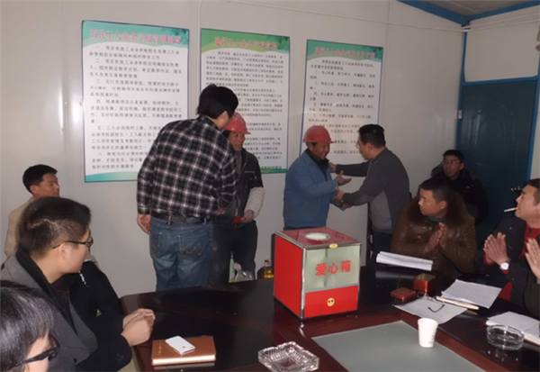 園區(qū)公舍三期西楚金地和白領(lǐng)公寓項目是今年園區(qū)的重點工程,為創(chuàng)建文明工地,構(gòu)建和諧園區(qū),營造關(guān)愛幫扶、互助互濟的良好氛圍,自開工以來,項目部辦公室就設(shè)立了募捐箱,并在元旦即將到來之際,用募集到的善款幫助工地上生活困難的建筑工人,讓困難工人群體感受到社會的溫暖和正能量,增強其歸屬感,在工地、在園區(qū)也能感受到家的溫馨。