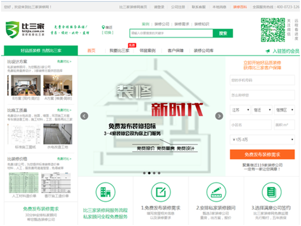 比三家裝修網于2015年10月份落戶蘇宿電子商務產業(yè)園,該裝修網定位于“互聯網+”大眾創(chuàng)業(yè)平臺,是一家扎根于三線城市,以“中介生意”模式幫助傳統(tǒng)的裝修行業(yè)的公司利用互聯網接到更多的訂單,幫助用戶找到合適的裝修公司。網站通過好品質裝修,比設計方案、比施工質量、比裝修價格,為用戶提供符合比三家裝修網標準的服務。