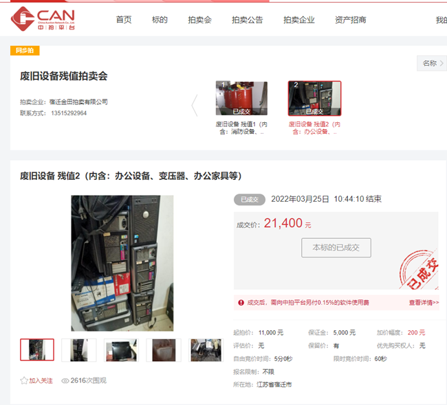 3月25日上午10時30分,開發(fā)公司一批廢舊辦公設備、辦公家具、變壓器等物資在中拍平臺公開拍賣,7家競買人,經(jīng)過14分10秒緊張激烈競價,最終以21400元成交。