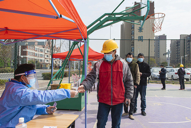 3月23日,蘇宿工業(yè)園區(qū)在一室外籃球場內對全區(qū)在建工程施工人員進行核酸抽檢。