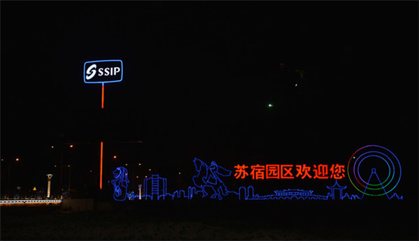 在園區(qū)東入口為民河的一畔,一座座生動的城市剪影燈光造型在青海湖西路兩側一字排開。有象征著新加坡元素的“魚尾獅”,有蘇州工業(yè)園區(qū)金雞湖畔的東方之門、摩天輪和李公堤,還有西楚霸王項羽騎馬的颯爽英姿。造型以蘇州、宿遷和新加坡城市建筑輪廓線、城市主題雕塑為基本元素,以剪影形式為載體,以現(xiàn)代高科技LED燈光為表現(xiàn)手段,通過炫麗動感的光影效果,在夜色中描繪出了一副靚麗多姿的畫卷,生動地展現(xiàn)出了園區(qū)“從新加坡到蘇州再到宿遷”和“在宿遷、為宿遷”的發(fā)展理念。
