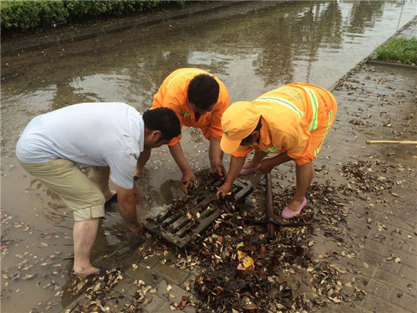 市政搶險疏通小組迅速調(diào)集人員及物資力量,開展區(qū)內(nèi)泄洪及排水工作。公舍等項目為迅速排澇,員工在水中冒雨架好水泵,安裝吸水管,鋪設(shè)排水水帶,發(fā)動機器快速排水,使公舍車庫等水位快速下降。