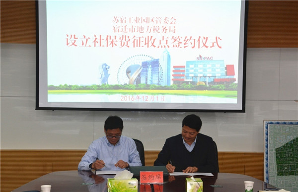 12月1日下午,園區(qū)管委會(huì)與宿遷市地稅局舉行設(shè)立社保費(fèi)征收點(diǎn)簽約儀式。副市長(zhǎng)、園區(qū)黨工委書(shū)記、管委會(huì)主任方文浜,市地稅局局長(zhǎng)王月明,園區(qū)工委領(lǐng)導(dǎo)戈亮、高揚(yáng)出席簽約儀式。